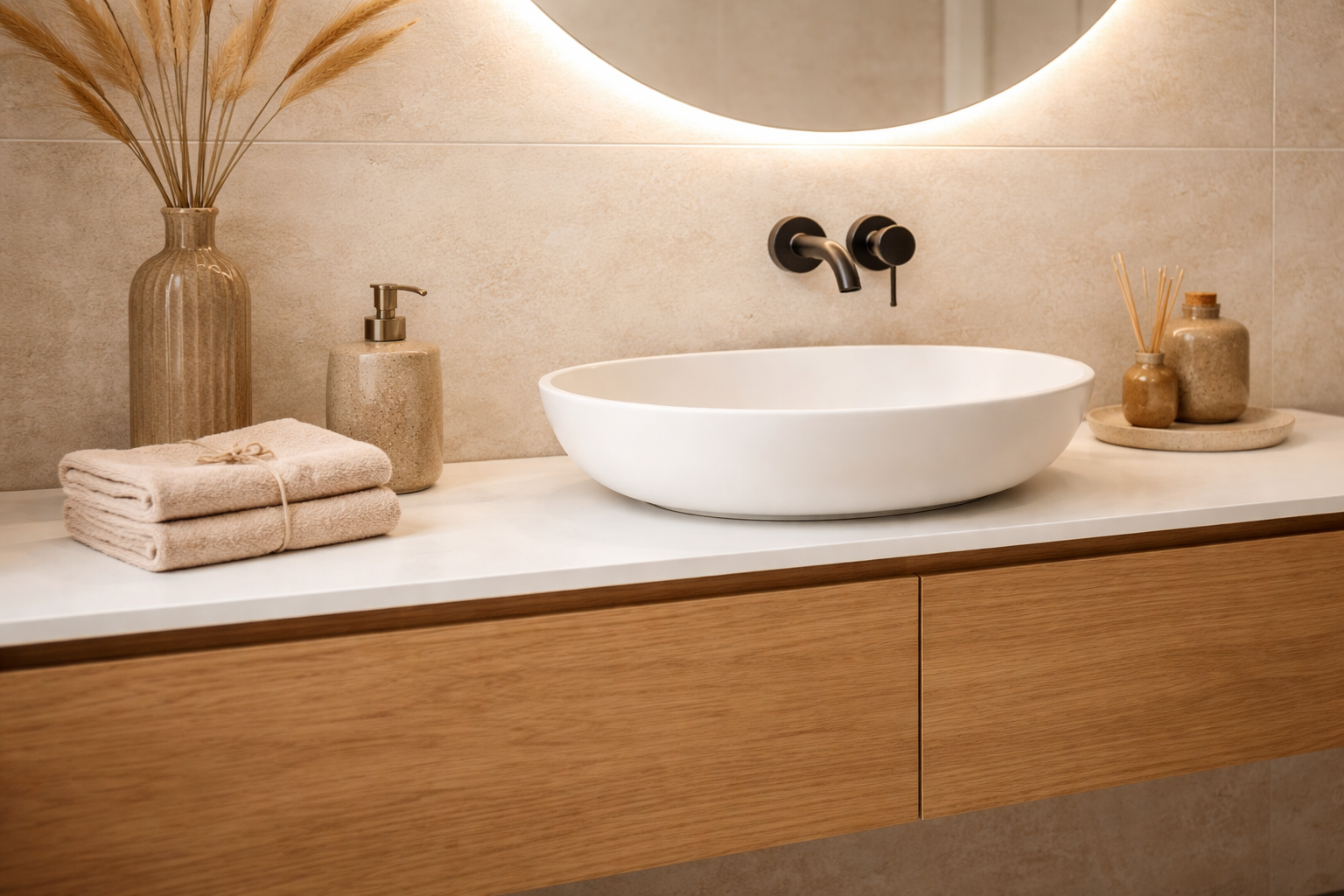 Las líneas curvas siguen teniendo un papel importante dentro del diseño de baño. Los lavabos redondeados o de sobreencimera aportan un punto diferencial sin romper la armonía del conjunto.